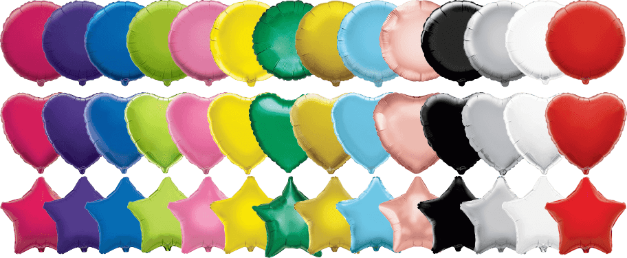 Choose your balloons from our full range of stars, hearts and circles in gold, silver, blue, light blue, green, lime green, purple, fuchsia, pink, red, yellow, rose gold, black and white.