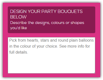 Nearly done after you've decided on your balloons, just tell us in as much detail as possible how you would like them arranged in the text box provided on the checkout page. You're now ready to continue!